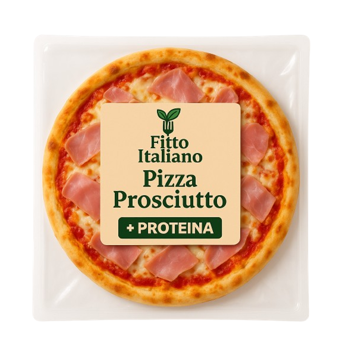 Pizza Prosciutto + PROTEÍNA Fitto Italiano: masa alta en proteína, salsa de tomate natural, queso fundido y jamón suave. Lista en minutos, ligera y perfecta para disfrutar de una pizza auténtica sin saltarte tus objetivos.